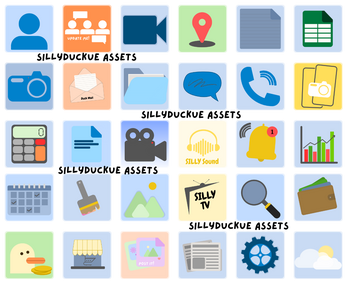 App Store • Duck Bank • Calendar • Calculator • Camera • Contacts • Doc • Email (Duck Mail) • Facetime • Files • Film • Gallery • Maps • Messenger • Music (Silly Sound) • News • Notes • Post It! (Instagram Knockoff) • Phone • Reminders • Search • Settings • Spreadsheets • Silly TV • Snappy (Snapchat knockoff) • Stocks • Themes • Update Me! (Facebook knockoff) • Wallet • Weather